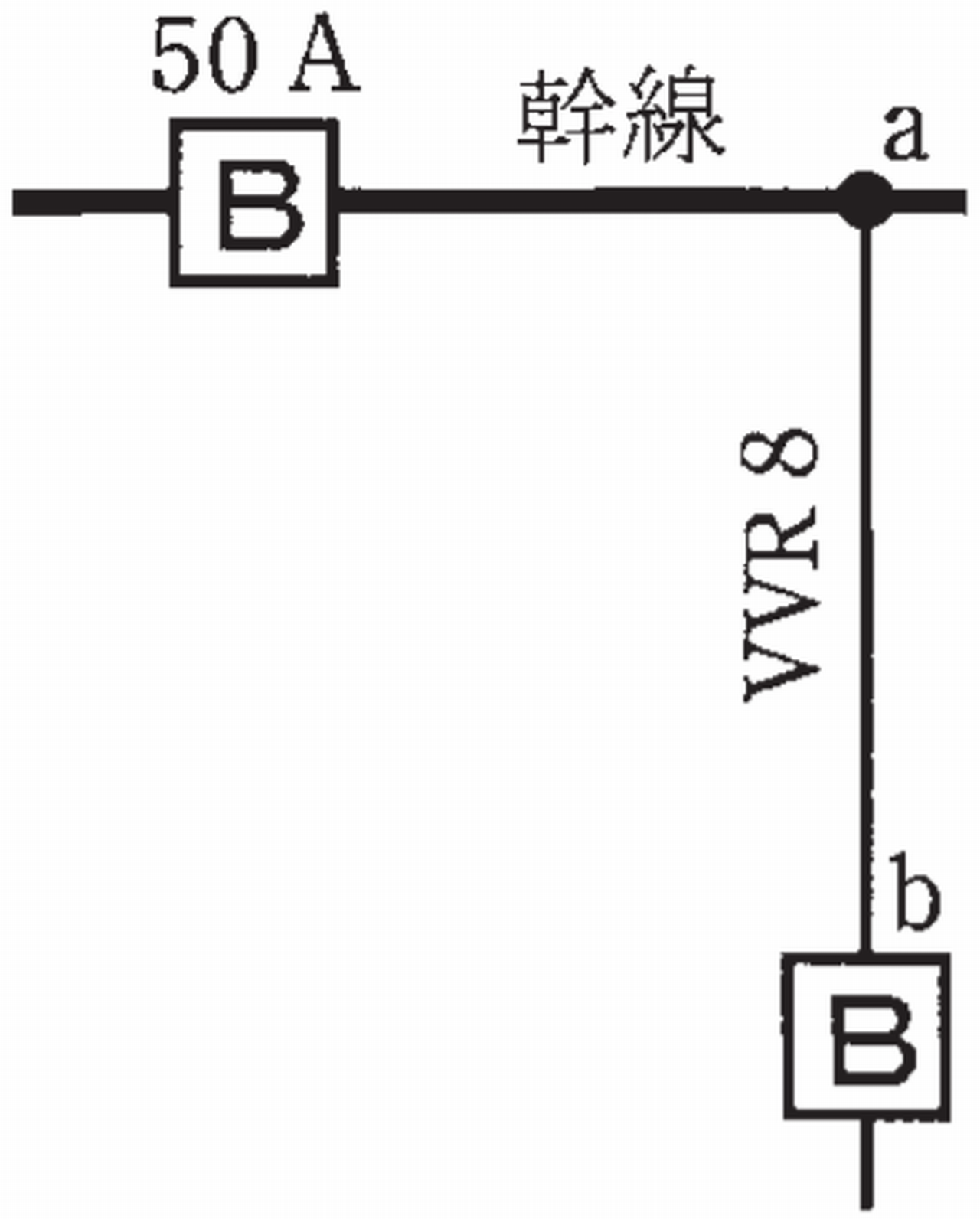 図のように定格電流50 Aの西lll線用遮断器で保護された低圧屋内幹線からVVRケーブル太さ8